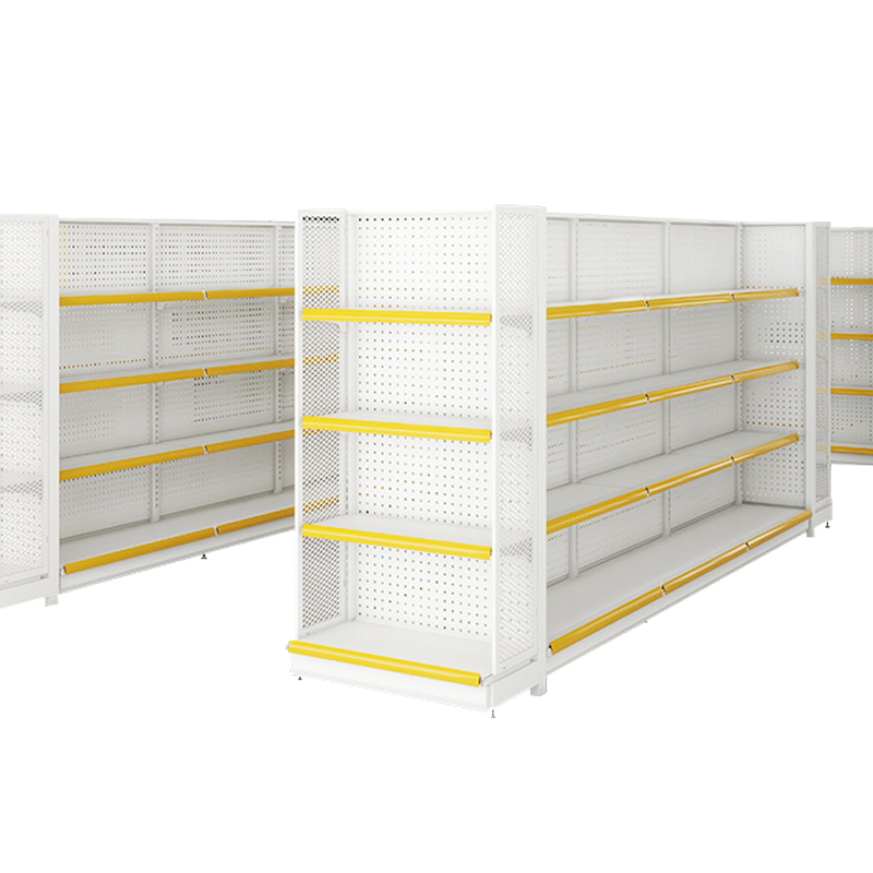 Moderne metalen schappen voor winkels en supermarkten met aanpasbare kleuren en maten.